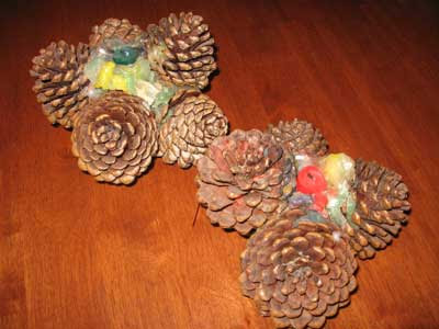 Fifty five years ago my father climbed a pine tree and cut two clusters of pine cones to make candle holders for the Christmas table. They are rather tatty now but we still use them every year. I wrap a bit of tinsel around them and tidy them up a bit. I have very fond childhood memories of collecting cones to make decorations and collected cones with our daughter when she was little. Directions on how to make Christmas Ornaments From Pine Cones are here