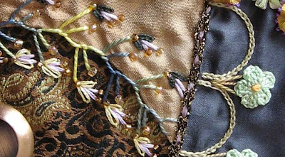 The flowers are little crochet motifs that I picked up at the craft fair. They are tiny smaller than a 5 cent piece. At the base of the scallops which are worked in chain stitch is a threaded chain stitch.