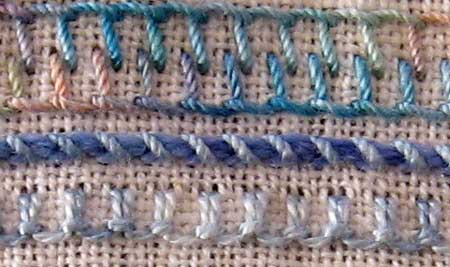 This band actually illustrates experiments with three stitches. The top line consists of two rows of buttonhole stitch, which is followed by whipped chain stitch. The last line is up and down buttonhole stitch.