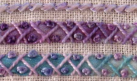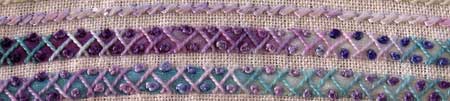 The first row in this band is twisted chain stitch. The second and third rows are made up of herringbone stitch and French knots used to couch down some hand dyed ribbon
