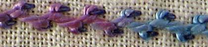 The foundation row of running stitch is worked in hand dyed mercerised cotton and it is threaded with a hand dyed silk both are dyed by me.