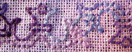 This section of my sampler is worked on 26 count linen which has been hand painted with procion cold water dyes.