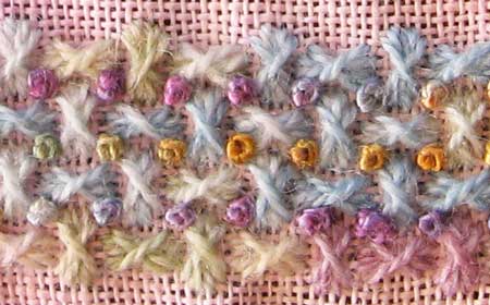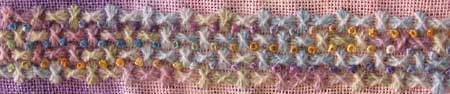 This is a band of a slight variety on a needlepoint canvas stitch which is called Fan Vaulting in Mary Rhodes Dictionary of Canvas Work Stitches (Batsford Embroidery Paperback). I increased the space a little and added some French knots in between the fanned stitches.