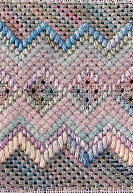 The upright cross worked as a canvas stitch is worked in hand dyed wool