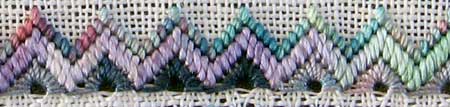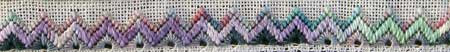 This band of stitching is created by first working a row of half Algerian eye stitch then working tow rows of straight stitch along the edge. The first row of straight stitch is wider than than the other.