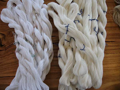 Since I often dye different threads in the same dye pot I tie off the skein with different yarns. One tip with this method however, if I am going to colour code the ties to tell which yarn is which I make sure I use synthetic yarns as the ties, as then they don’t dye and I still have the colour code in place! When the skeins are dyed and dry I can tell which yarn is which. Below are two types of cotton tied off with different coloured thread so I can tell which is which at the end of the process.