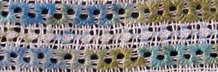 This row of stitching sits below the large crab motif (and actually needs to be pressed straight!) but you can still see what is happening. The band of stitching is a line of half Algerian Eye stitches that are offset as they are worked. The middle row is line of Four sided stitch.