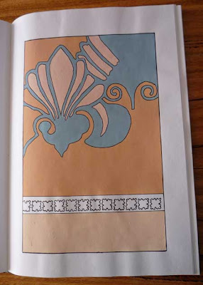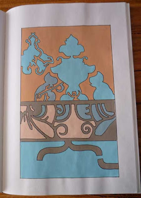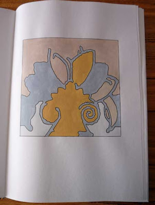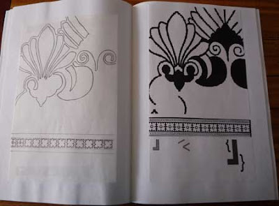 I took a traditional pattern, simplified a black a white image of it scaled it up on a graphics program (Adobe Illustrator) and played around with it to produce this shape which I then embroidered. I thought I would show you some of my ideas from my studio journal.
