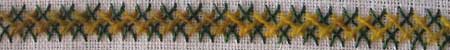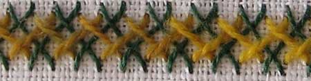This band of stitching is created by working two lines of herringbone stitch. The second row (yellow) is worked on top of the first