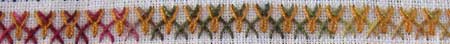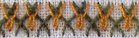 This band of stitching is created by working a line of herringbone stitch which has been tied with a variety of fly stitch. Instead of having a single stitch tie the “V” shape a detached chain stitch has tied the fly.