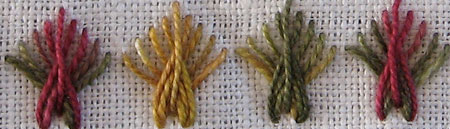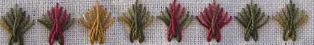 Like band 141 this band of stitching is created by working the cross of herringbone stitch on top of each other but this time it is sprayed out like a fan. The movement and rhythm of the stitch is very similar to herringbone. If you look at band 140 you will see how the idea was developed. I am sure someone else has thought to work this variation too but I have not seen it documented.