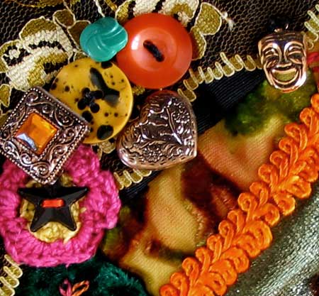 This cluster of buttons and charms is the last detail on block 20. When I introduced the block I explained how it has a theatre theme because when Eve was younger pre circus days she was very active in the theatre.