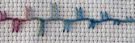 This is another variation on basic buttonhole stitch which is set in pairs that step and swing from side to side.
