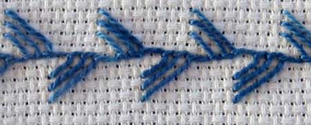 This is variation on basic buttonhole stitch which is worked in units of 3 arms that swing from side to side.