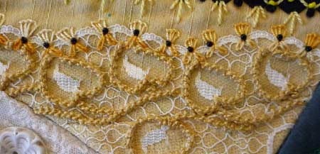 This seam was first covered by a braod band of lace. I next picked out the pattern in triple Palestrina stitch using perle 8 thread. Along the edge of the lace I worked small quarter buttonhole wheels. At the base I added two detached chain stitches and added a seed bead at the top of these.