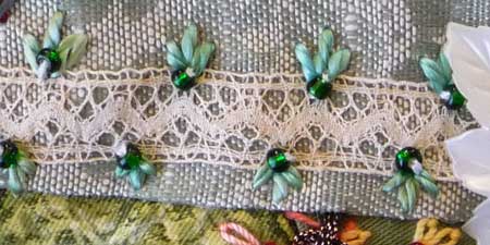 This detail decorates the sides of lace with three straight stitches and seed beads