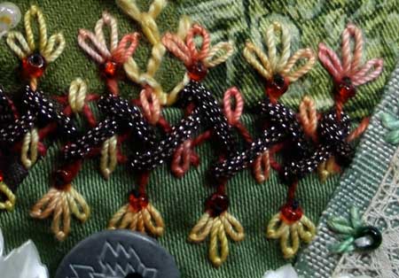 My next journey was to work detached chain stitches arranged like part daisies placed above a straight stitch on the bar of the chevron stitch.
