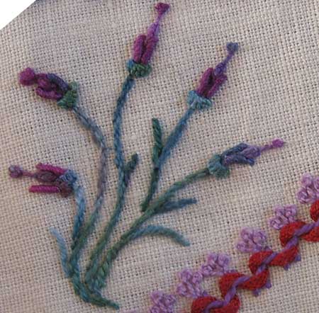 This motif is made up of stem stitch, bullion knots, cast on stitch, oyster stitch and pistil stitch.