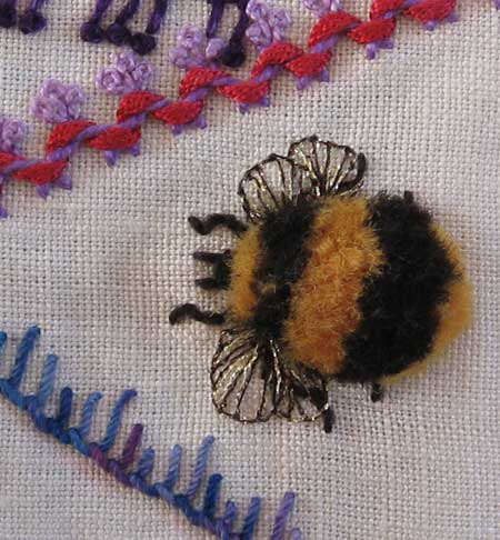 This motif is another that looks better if it not scaled up so large! The wings are made up of part buttonhole wheel. The tufty body is Ghiordes Knot. In fact I had used this little section of the fabric as doodle to test this pattern when after a few years I rediscovered the stitch doodle and decided to make the rest into a sampler! So this little fellow is a stitch doodle