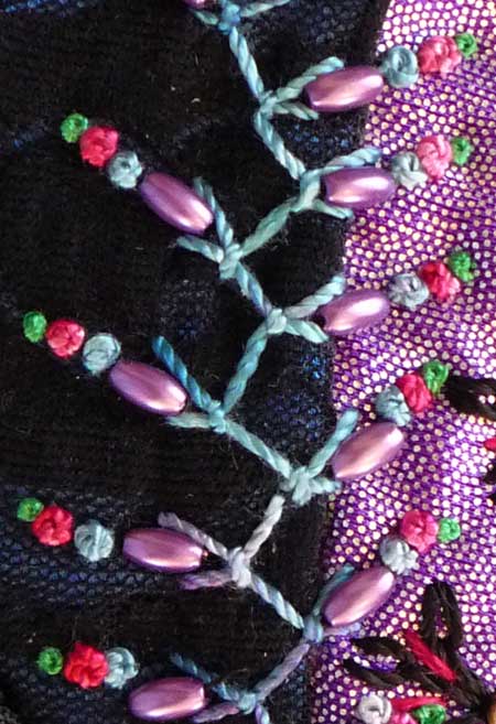 This seam is embellished with a zig zag pattern of up and down buttonhole stitch. On a second return I tucked a bead into the middle of the twin prongs nad then topped them off with French knots