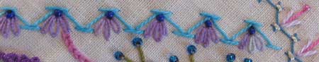 This motif is made up of detached chain stitches, and chevron stitch. Seed beads are used in the middle of half daisy flower.
