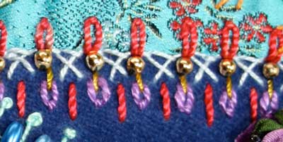I first worked a line of crossed buttonhole stitch then tucked detached chain stitches either side of that and further decorated the seam with straight stitches and beads.