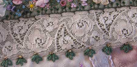This detail of the sampler on section 25 is a band of vintage lace. Along the edge I have worked a version of buttonhole stitch in a metallic DMC thread that is gold with a black twist of thread spun with it. It comes on a reel and named “antique gold”. It is marked Made in Belgium and would have to be one of my all time favourite metallic thread for hand work. I then topped the arms with a green seed bead.