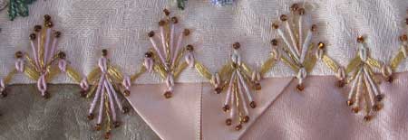 This seam on section 25 is a pattern created from detached chain and straight stitches and laced with rayon ribbon floss. The stitches are worked in hand dyed cotton and a metallic gold thread topped with seed beads.