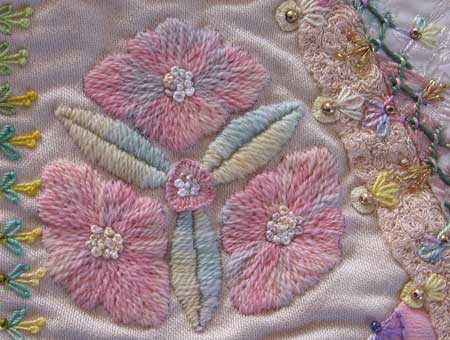 This area on section 25 of the For love of stitching band sampler is a motif worked in wool in long and short stitch.