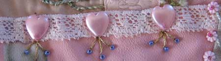 This lace embellished seam is found on section 25 of the For Love of Stitching band sampler. The lace is further embellished with heart shaped and seed beads and small straight stitches worked in a metallic thread.
