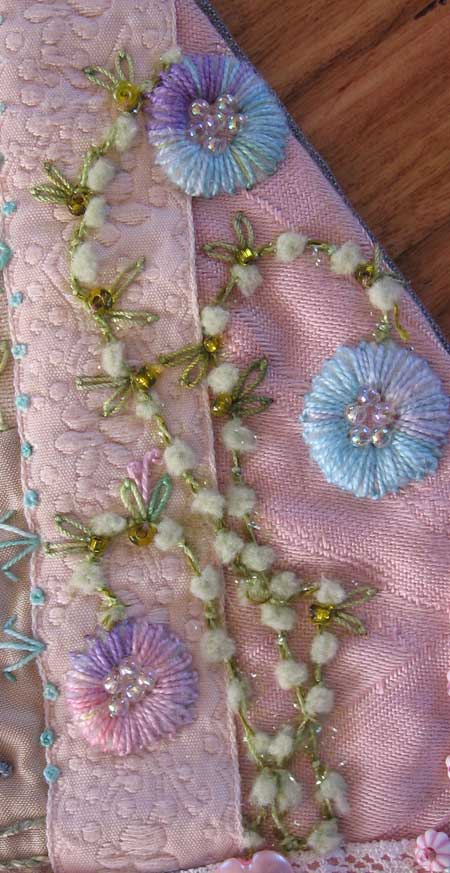 This motif is worked over a vintage ribbon. It is made up of flowers worked in padded detached chain stitch which is chain stitch worked over a small felt disk. I used a hand dyed perle #8 cotton thread. The stem of the flowers is represented using a textured knitting yarn that I couched into place then worked detached chain leaf shapes. Seed beads finished it off.