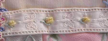 This seam is embellished first with some lace then some small embroidered rose buds. The rose buds are made of bullion knots worked in hand dyed wool and the bud is fly stitch worked in perle #8 cotton which is also hand dyed.