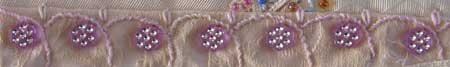 This motif is whipped stem stitch a small detached chain stitch and bead. It is worked using a perle #8 cotton thread which was hand dyed by me using procion dyes.