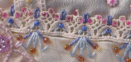 This last seam is the embellished the edge of lace which has bean beaded and decorated with detached chain stitch.