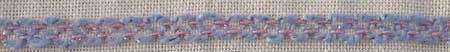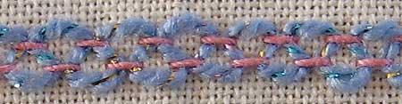 The foundation row of running stitch is cotton and the lacing is done in a wool that has a fine metallic thread twisted through it.