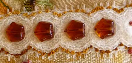 This is some cheap nylon lace which I have embellished with beads down the middle. Along the edges of the lace I have worked a line of French knots .
