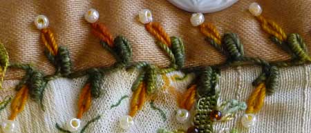 This seam is embellshed with an up and down feather stitch variation, as one of the spines is a bullion knot. Tucked between the spines are detached chain stitches, topped with a seed bead.