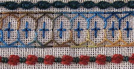 These three bands on section 27 of the For the Love of Stitching band sampler are worked in perle #5 and cotton all of which was hand dyed by me. The top row is a line of oyster stitch the middle is an arrangement of straight stitches and half chevron stitch and the last row is Fancy hem stitch wrapped very tightly