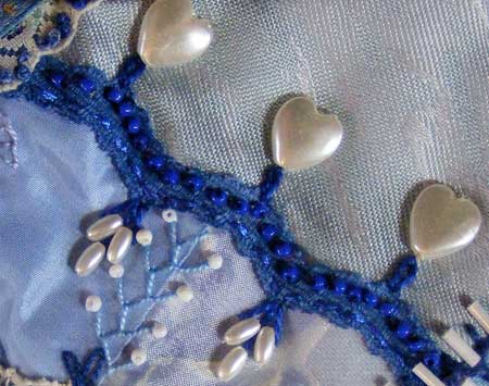 This is the first detail on block 34. The seam is covered with a cheap nylon lace which I dyed and beaded. The cluster of oval shaped beads hang from a fan of three straight stitches and the hearts have a single detached chain stitch at their base.