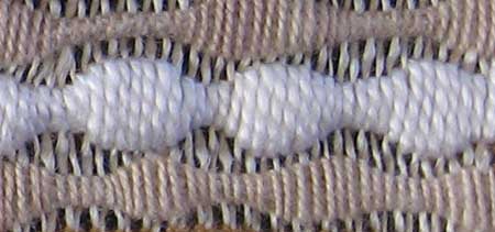 This area on section 28 of the For the Love of Stitching band sampler is a pattern of straight stitches which have been pulled at different tensions.