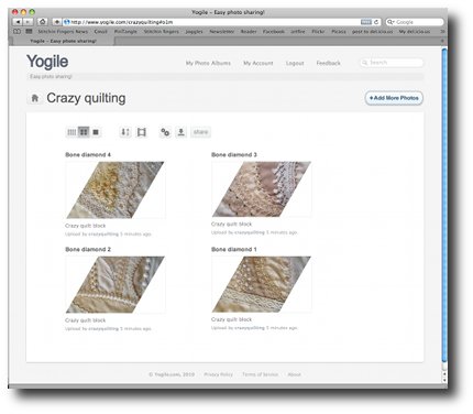 I know loads of people have folders full of stuff to browse when inspiration is a bit thin on the ground. Imagine if in one click you could gather together all the TAST challenge photos to browse, or some of the eye candy from the crazy quilt groups. A feature I really like is that you can download all the contributed photos in a zip file. Obviously this feature is not for theft but it sure is a great way to collate together and archive stitchers eye candy.