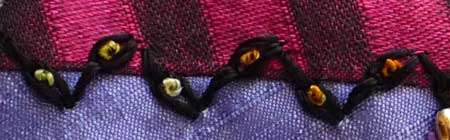 This detail is made by creating a line of feathered chain stitch (also called long armed zig zag chain) with a French knot worked in the middle of each chain.