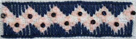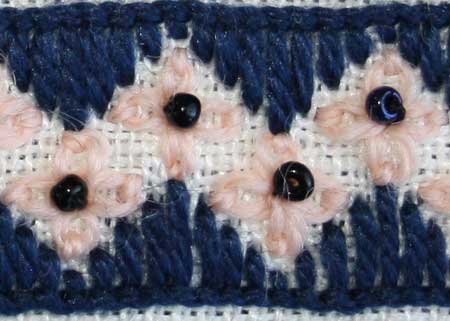The is pattern created by first working two lines of buttonhole stitch with the arms at different heights to make triangular formations along the line. In the peaks and valleys I have added a small flower motif. Seed beads were added to the centre of the little apricot flowers made of detached chain stitch (lazy daisy stitch)