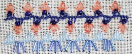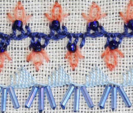 These are two bands worked so close together that I decided to cover them both at the same time. Both are varieties of buttonhole with beads added. The top line had detached chain and straight stitch added.