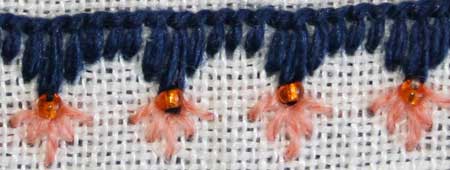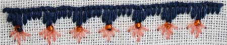This band is made up of buttonhole worked reasonably close together in a scallop formation. At the peak of each scallop I worked 5 straight stitches in a fan shape and added a seed bead to the middle.
