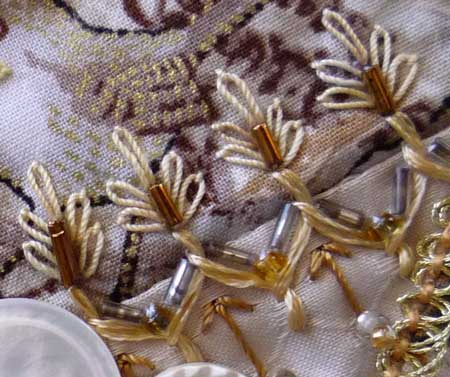 This seam detail on block 39 has a foundation of Cretan stitch which has been decorated with detached chain stitches, straight stitches, bugle beads and seed beads.