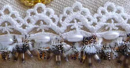 This seam on block 39 has been covered with lace. On the base I have laced a novelty thread before adding beads.