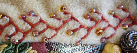 This hand embroidered seam on block 40 is a favourite of many crazy quilters. It is feather stitch further embellished with seed beads.