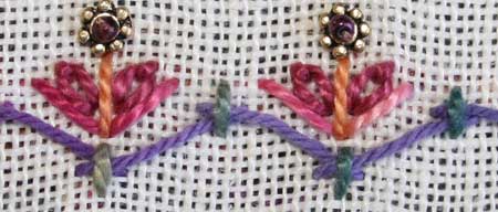 The band consists of laced cross stitch, straight stitch, detached chain stitch and small metal beads secured with a seed bead.