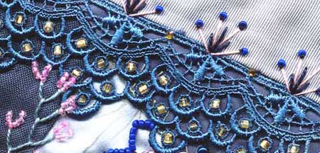 This seam is on block 42 of the I Dropped the Button Box crazy quilt. I covered it with a piece of hand dyed lace, added some straight stitches in fan formations along the top and then decorated both lace and stitching with seed beads.